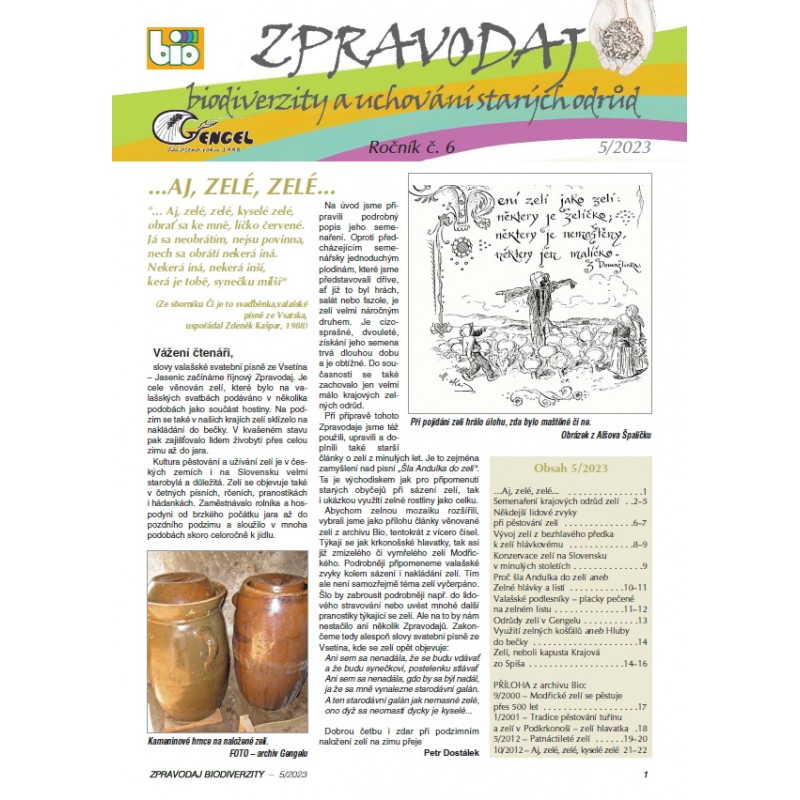 Obsah Zpravodaje 5/2023 – tematické číslo, věnované zelí. 22 stran A4 ve formátu .PDF. …Aj, zelé, zelé… str 1, Semenaření krajových odrůd zelí 2–5, Někdejší lidové zvyky při pěstování zelí 6–7, Vývoj zelí z bezhlavého předka k zelí hlávkovému 8–9, Konzervace zelí na Slovensku v minulých stoletích 9, Proč šla Andulka do zelí aneb Zelné hlávky a listí 10–11, Valašské podlesníky – placky pečené na zelném listu 11–12, Odrůdy zelí v Gengelu 13, Využití zelných košťálů aneb Hluby do bečky 14, Zelí, neboli kapusta Krajová zo Spiša 14–16, PŘÍLOHA z archivu Bio: 9/2000 – Modřické zelí se pěstuje přes 500 let 17, 1/2001 – Tradice pěstování tuřínu a zelí v Podkrkonoší – zelí hlavatka 18, 5/2012 – Patnáctileté zelí 19–20, 10/2012 – Aj, zelé, zelé, kyselé zelé 21–22. Elektronické spisy z e-knihovničky (kód KNIE000) zasíláme vždy po odeslání osiv starých odrůd na začátku měsíce. Jsou zaslány emailem jako soubor ve formátu .PDF.